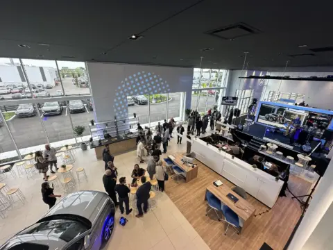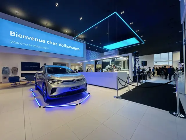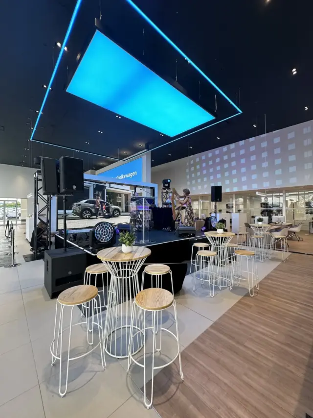 La salle de démonstration s’est transformée en un véritable espace prestige, aménagé avec des tables cocktails, tabourets design, un tapis rouge et des bars élégants, créant une atmosphère chic et sophistiquée. Chaque élément du décor a été minutieusement pensé pour maximiser l’impact visuel et offrir un cadre enchanteur.